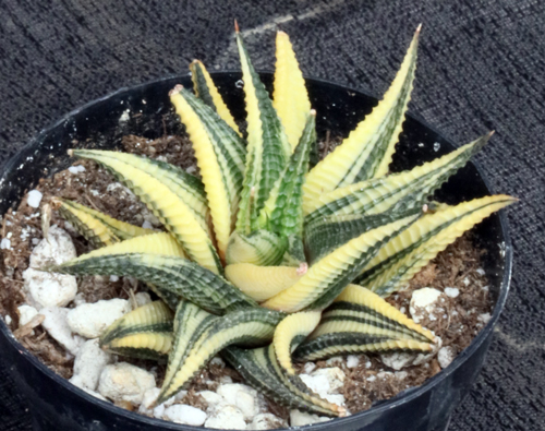 We have quite a few Haworthia limifolia with various levels of variegation on the leaves. These plants have strikingly yellow variegated and highly variable leaves. These plants are rooted offsets in 4-inch pots.