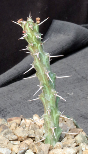 This is yet another of the interesting species near the Kenya-Ethiopia-Somalia border. The original material (Lav 12224) came from Mecha Mari, Kenya. Euphorbia actinoclada is a low, spreading, spiny shrub with beautiful dark-green stems striped in yellow. The cyathia are orange-red. These rooted cuttings fit into 4-inch pots.