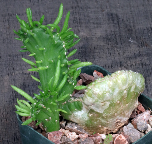 Austrocylindropuntia subulata, which some botanists consider to be Opuntia subulata, is widely cultivated in living fences in South America, and likely it originated in Peru. It has numerous cylindrical green stems with numerous yellow spines and, understandably, is effective as a living fence. These crests have fewer spines but are quite nice. These plants are rooted cuttings in 3-inch pots.