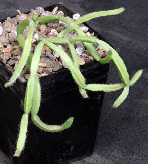 This species of epiphytic cactus is native to tropical areas of Central and northern South America. These plants originally were named Rhipsalis rauhiorum for Werner Rauh, a famous German scientist. Usually 2 angled, sometimes 3-angled, the green stems are typically unarmed and flexible. The flowers are small and white. These plants are rooted cuttings in 5-inch pots.