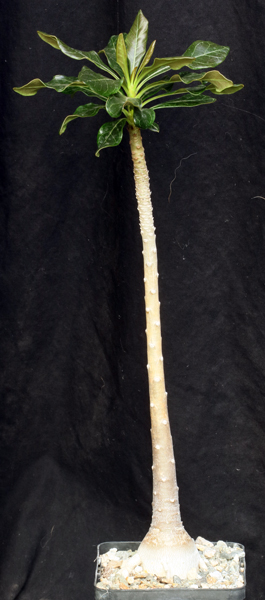 From Socotra, this is the largest variety of Adenium but is extremely slow growing. It is distinctive in just about every way from other Adenium species, and it tends to go dormant at different times. For us, it typically goes dormant during the spring and early summer, the prime growing time for most Adeniums. You should be an expert grower to handle this species, and you should expect that there could be extended periods of dormancy. These seedlings are in 5-inch pots.
