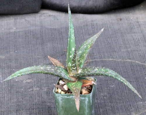 Aloe turkanensis, previously rare in cultivation, is a distinctive maculate species from the Rift Valley of northern Kenya. What really sets this species apart are the large white spots on the light-green leaves. These plants are from seed from Lake Baringo, south of the species namesake Lake Turkana. Our plants are seedlings in 2-inch pots.