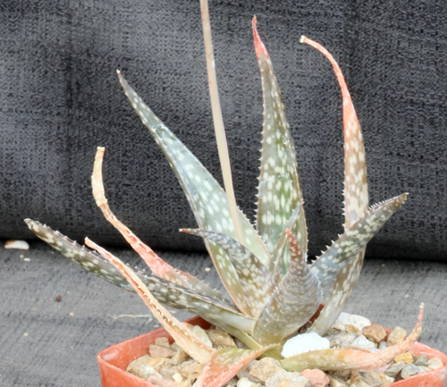 This species, from Madagascar, forms a clump of small rosettes. This poorly described member of the A. deltoideodonta complex was originally collected by Rauh and is described in the Aloes of Madagascar book. The leaves are deltoid-shaped, as the name indicates, and are light green with spots. This does not meet any of the original concepts of A. deltoideodonta, and Rauhs own books (volume 1, 1995) called this a variegated form (see photograph on p. 212). These offsets are rooted in 4-inch pots.