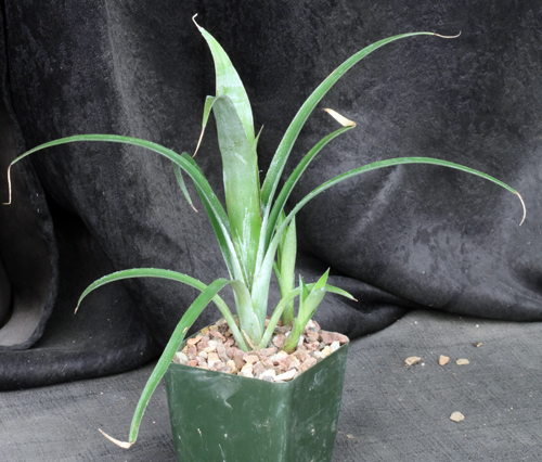 From Brazil southwards to Argentina, this species of terrestrial bromeliad, with a common name of Queens tears, has rather ordinary looking gray-green thin leaves and a small urn-shaped rosette. The flowers are rather interesting with their red bracts and blue-yellow petals. These plants are rooted offsets in 4-inch pots.
