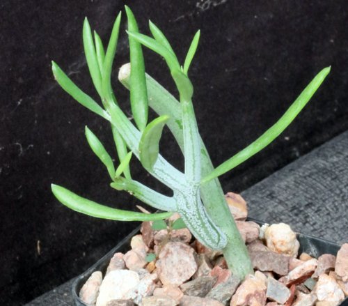 We’ve reverted to the genus Kleinia for plants in this group with no ray flowers. Once considered in the genus Notonia, Kleinia descoingsii is from Madagascar, and these plants are propagated from material originally collected along the Fiherenana River east of Tulear. This multibranched subshrub has densely packed stems that are light green and streaked with white. The flowers are the typical yellow-white Composite flowers. These plants are established offsets in 2-inch pots.