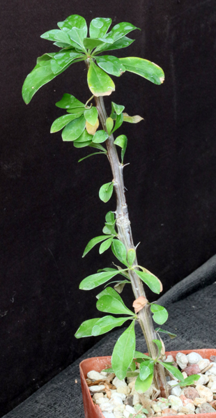 Fouquieria ochoterenae is a small tree from southern Mexico. It is a narrow endemic that typically grows on selenite and gypsum in the states of Oaxaca and Puebla. The leaves are a dark green, and the flowers are dark red and very showy. These plants are rooted cuttings in 4-inch pots.