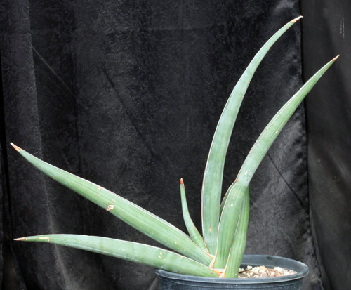 Sansevieria dhofarica is from the Dhofar of Oman. It has an olive-green appearance in its distichous leaves, and it is quite large and slow growing. The leaf coloring distinguishes this species from any other in the Sansevieria ehrenbergii group, all of which have yellow-green leaves except S. dhofarica. These plants are rooted offsets in 2-gallon pots.