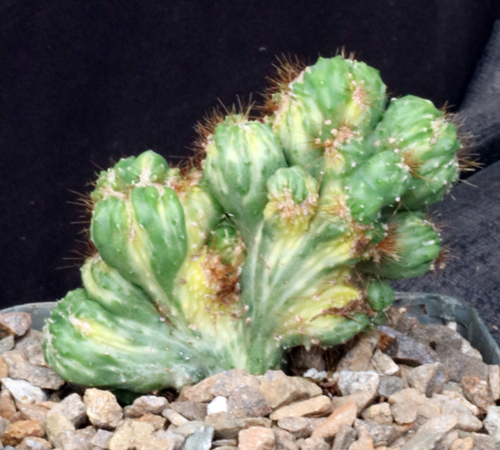 The iconic Cereus peruvianus has been moved to another genus, except here, where we keep it separate. These plants are from seed collected from what might be considered the standard monstrose version of this species. These plants have yellow and pinkish blotches on the crested parts. These plants are rooted cuttings in 5-inch pots.