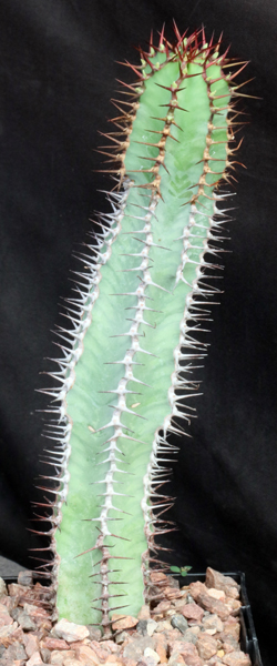 This beautiful shrubby species is from northern Namibia and probably extends into Angola. Its stems are blue-green in color with nice variegation on the stems, and the 4-6 flutes that typically form are lined with paired spines. The cyathia are yellow. Unlike the typical species, this form is a larger shrub, and its seed capsules bear 3-5 seeds that are easily 2-3 times larger than the typical, which is probably sufficient to describe this as a new species. These plants are seedlings in 5-inch pots.