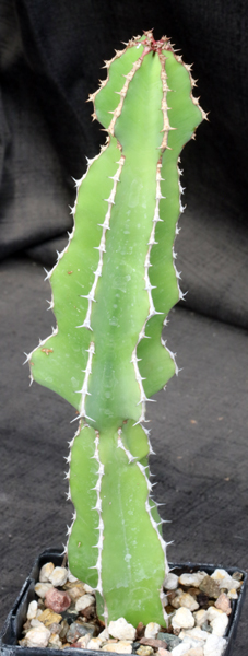 This species of tree Euphorbia, from the Wankie District of Zimbabwe, is really special. It is known for its stem constrictions and fiercely spined margins, which are an extremely nice combination. Like many tree Euphorbias, the branches gracefully curve upwards. The cyathia are yellow. These plants are rooted cuttings in 4-inch pots.