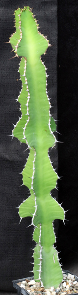 Distributed from Zimbabwe south into KwaZulu-Natal Province of South Africa, this tree Euphorbia is very nice for its graceful, up-curving branches at maturity. The branches have undulating constrictions that look like waves, and the spines are quite small and inconspicuous at maturity. The cyathia are yellow. These plants are seedlings in 5-inch pots.