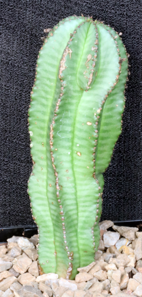 Euphorbia polygona forms tall, columnar stems that are green with a blue-grey cast. The crowning spines tend to be reddish when growing. These seedlings are in 5-inch pots.