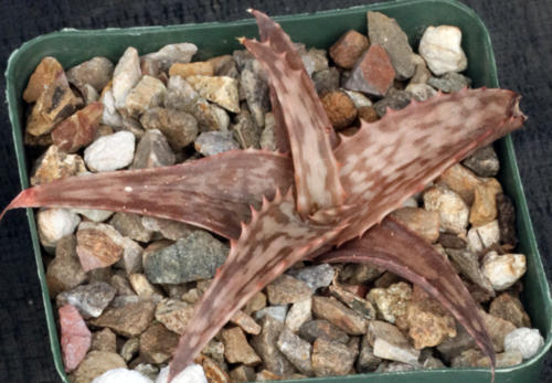 This recently described species is from the coast of Mossuril Bay in northern Mozambique. It is fairly unique among Aloes for the strong brown-green color and bold white spots of the leaves, which clasp along the stems. The plants strongly clump, forming small shrubs with upright stems. The flowers are light red and appear to be difficult to attain in cultivation. These plants are rooted cuttings in 4-inch pots.