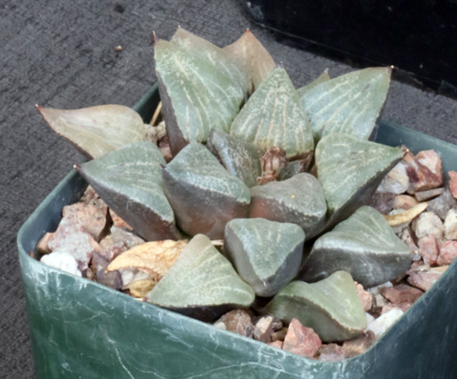 From the Western Cape Province of South Africa, this is a chunky, solitary retuse-leaved rosette, beautifully marked with white, pinkish and brown lines and flecks on upper leaves. Part of one of the best groups of Haworthia, Bayer (1999) considers this one to be the standard Haworthia emelyae var. emelyae. George Lombard collected the original plants (GL 4108). These plants are seedlings in 4-inch pots.