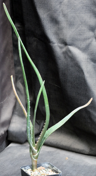 Previously known as Aloe bainesii, this tree Aloe can grow to 50-feet high on the east coast of South Africa. Aloe barberae forms a thick trunk with many branches, and it has leaves that are recurved and deeply channeled with minute white teeth on the margins. We have a plant outside in a protected spot in Tucson. We are offering this species in 5-inch pots.