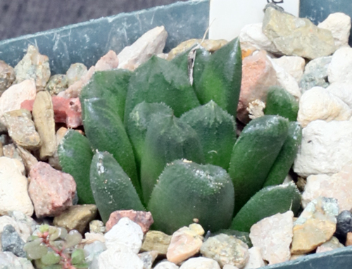 Haworthia heidelbergensis is another of the hard-bodied Haworthias that is found in the vicinity of Heidelberg, Western Cape Province. Crossed with H. truncata, it has greenish-black stems with blunted leaves. These plants are seedlings in 4-inch pots.