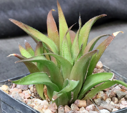 This beautiful light brown species came from material originally collected near Brede River, Western Cape Province of South Africa. This variety offsets quite slowly, unlike some other varieties of Haworthia venosa, and the plants can become quite large in cultivation. The light brown upper surface tends to be relatively smooth and veined, while the lower surface is roughened with numerous small tubercles. These plants are seedlings in 5-inch pots.
