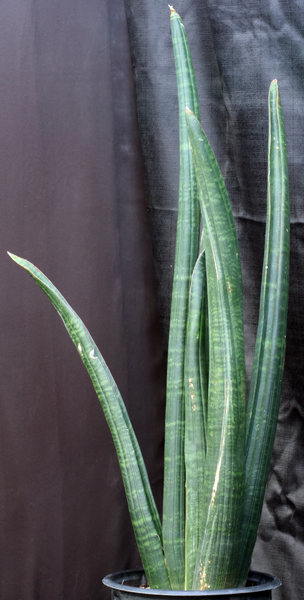 This species is from southern Malawi, and these plants are propagated from material originally collected by Dave Richards (R1734). Once known as Super Bat, it has a brownish green color with little variegation and a channel that runs the full length of the leaf. The capitate flowers arise from the roots and are purplish-white. These plants are rooted offsets in 5-gallon pots.