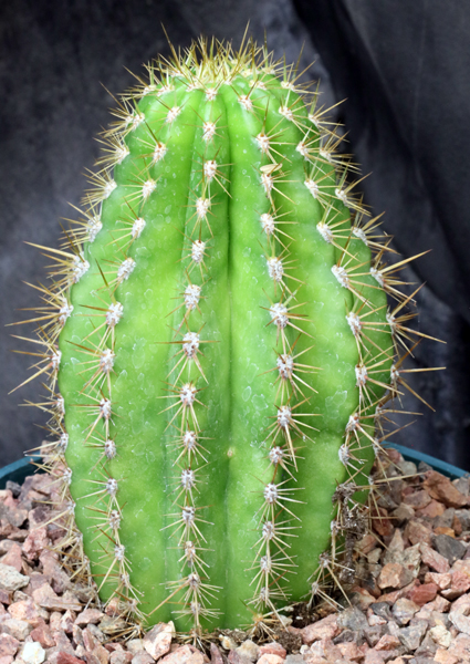 From Bolivia and Argentina, this shrubby, sprawling cactus forms clumps with numerous rather short stems. The stems are the typical yellow-green color of Trichocereus, with numerous ribs and spines, and the flowers are large and white to medium pink. These plants are seedlings in 8-inch pots.