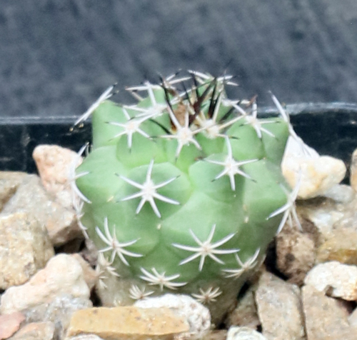 From San Luis Potosi, Mexico, this species is part of the highly variable Turbinicarpus schmiedickeanus complex. It has more of a dark blue-green globose body than does T. schmiedickeanus. The flowers are white to yellow. These tiny plants are seedlings in 2-inch pots.