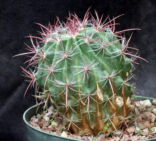 Reputedly one of the best of this fantastic genus, Ferocactus pilosus is from north-central Mexico. It has a typically solitary form, although offsetting forms do occur, and the plants are globose with reddish spines on the ribs that are not differentiated into centrals and radials. The flowers are yellow to red and are produced near the apical meristem. These plants are seedlings in 8-inch pots.