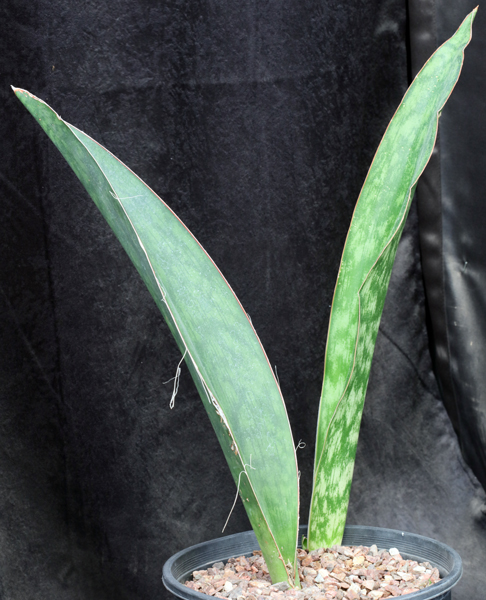 This broad-leaf Sansevieria from southwestern Kenya is part of the Sansevieria elliptica group. These plants were propagated from material originally collected to describe this as a species (WY 1235). The leaves have a green background with extensive mottling as is typical of this group, and the leaves are rough on the underside at least. These plants are rooted offsets in 3-gallon pots.
