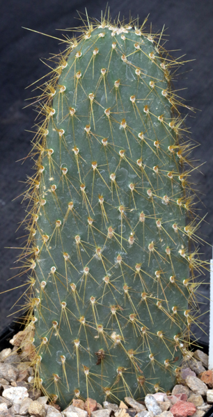 This species is from the Galapagos Islands. It has pads with the distinctive yellow spines, turning brown with age, and tiny glochids. The flowers are yellow. These plants are rooted offsets in 5-inch pots.