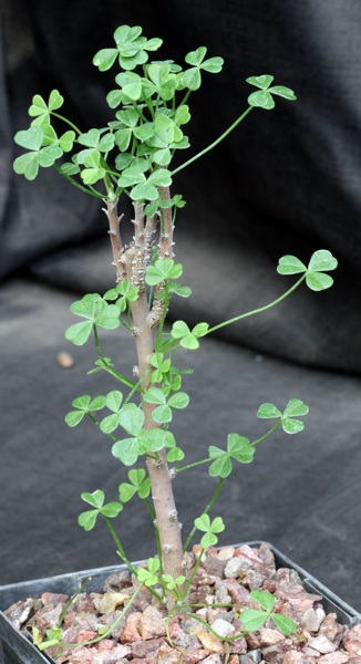 This highly unusual species is from coastal Chile, where it is a pachycaul shrub. The small succulent leaves, produced mostly in winter, are a glossy green and have an axial fold. The flowers are bright yellow. These plants are difficult to grow and are intolerant of summer watering or rainfall. These plants are rooted cuttings in 5-inch pots.