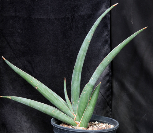 Sansevieria dhofarica is from the Dhofar of Oman. It has an olive-green appearance in its distichous leaves, and it is quite large and slow growing. The leaf coloring distinguishes this species from any other in the Sansevieria ehrenbergii group, all of which have yellow-green leaves except S. dhofarica. These plants are rooted offsets in 2-gallon pots.
