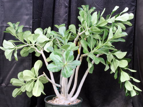This is a Mark Dimmitt creation of multiple crosses to try and produce a plant with a large, Adenium obesum type flower with reddish flowers. It would be for you to decide whether he succeeded or not. These plants are seedlings in 4-gallon pots.