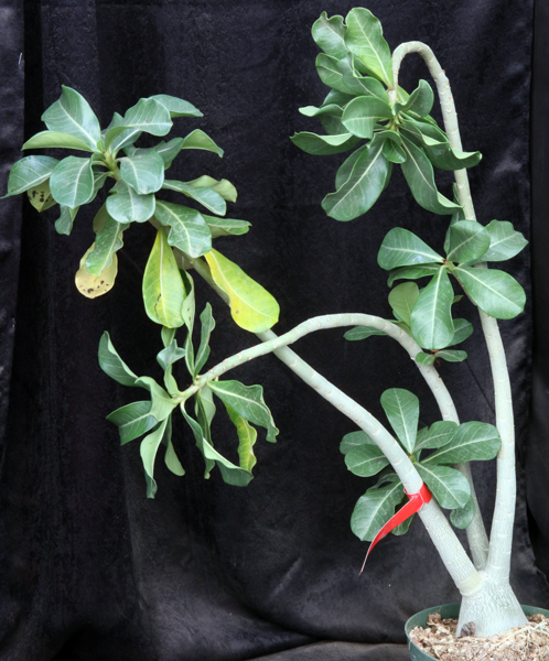 This is a Mark Dimmitt creation of multiple crosses to try and produce a plant with a large, Adenium obesum type with reddish flowers. It would be for you to decide whether he succeeded or not. These plants are seedlings in 4-gallon pots.