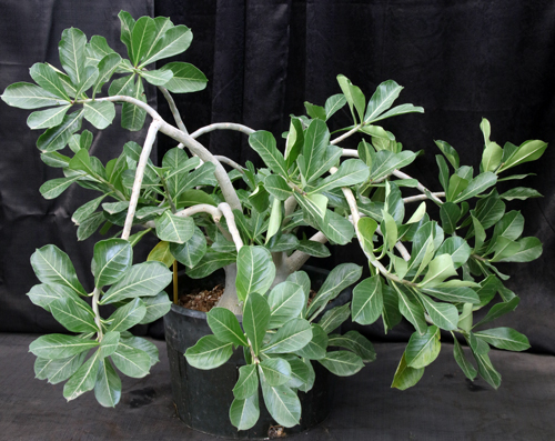 This is a Mark Dimmitt creation of multiple crosses to try and produce a plant with a large, Adenium obesum type with reddish flowers. It would be for you to decide whether he succeeded or not. These plants are seedlings in 5-gallon pots.