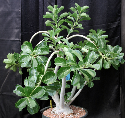 This is a Mark Dimmitt creation of multiple crosses to try and produce a plant with a large, Adenium obesum type with reddish flowers. It would be for you to decide whether he succeeded or not. These plants are seedlings in 5-gallon pots.