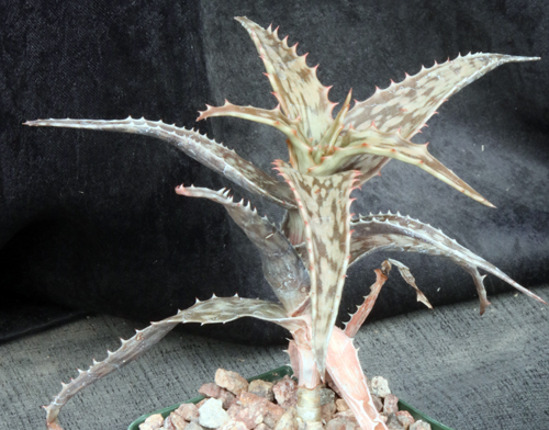 This recently described species is from the coast of Mossuril Bay in northern Mozambique. It is fairly unique among Aloes for the strong brown-green color and bold white spots of the leaves, which clasp along the stems. The plants strongly clump, forming small shrubs with upright stems. The flowers are light red and appear to be difficult to attain in cultivation. These plants are rooted cuttings in 4-inch pots.