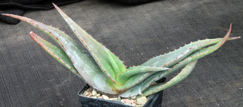 We previously listed this offering as Aloe sp. aff. doei from Yemen, then as A. splendens, now as A. lavranosii after John Lavranos, who originally described the species. This Aloe has beautiful bluish-green unspotted leaves and forms solitary rosettes. Its flowers are yellow and quite hairy, in line with the original description of Aloe doei. This plants are seedlings in 4-inch pots.