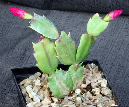Schlumbergera, or Christmas Cactus, is from eastern coastal Brazil. This genus has been hybridized considerably, so determining the genetic roster or any plant is difficult. A cluster of green leaves with purple veins is produced from fibrous roots, and these plants offset considerably. The flowers are red and more or less tubular. These plants are rooted cuttings in 5-inch pots.