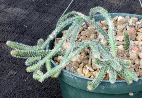 This species of Rhipsalis is the only cactus native to Madagascar, and it has been lumped as a subspecies of R. baccifera. This interesting species, which can either grow in trees (where humidity is high) or in the ground, appears to have many spines on its stem, but these are merely soft bristles. The flowers are small and white. These plants are rooted offsets in 6-inch pots.