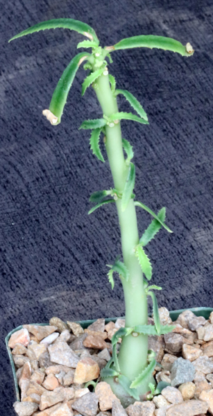 This species is from a broad area of tropical East Africa. We suspect that this is var. schlechteri because it has more slender stems and seem to grow taller than the typical species. Those stems are light green and bear obovate leaves that are distinctively crisped. The cyathia are circular with long marginal appendages. These plants are seedlings in 4-inch pots.