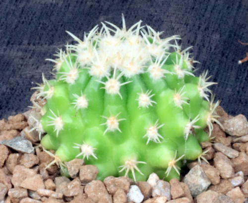 Golden Barrels are from a restricted area in Queretaro, Mexico, where they are nearly extinct in the wild. Variety brevispinus has short spines on elongated tubercles raising above a yellow-green body. The flowers are insignificant. These plants are seedlings in 5-inch pots.