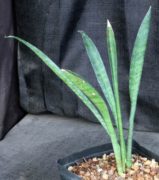 This plant is of unknown origin somewhere in southern Africa. It has a dwarf personality with narrow leaves sort of reminiscent of Sansevieria aethiopica but more flexible and with patterning like S. hyacinthoides only with more narrow leaves. The really distinctive feature of this undescribed species are the subcapitate flowers held in a rather short inflorescence. These plants are rooted offsets in one-gallon pots.
