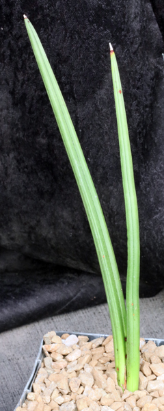 This is a relatively small species from Madagascar. Like the full-size species, these plants have long, round leaves with 5-6 channels, superficially resembling S. erythraeae. The leaves on S. canaliculata, however, are light green compared with the typically darker S. erythraeae, which comes from region centered on Ethiopia. These plants are rooted offsets in 5-inch pots.