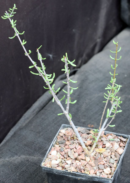 This succulent shrub from South Africa and Namibia has miniature pink flowers. It is common in the Richtersveld in the hyperarid area of the Northern Cape, and it forms a caudex when buried by sand. The leaves are pale green and fleshy, and the branches taper to a fine diameter at their ends. This unusual form has greatly reduced leaves. These plants are rooted cuttings in 5-inch pots.