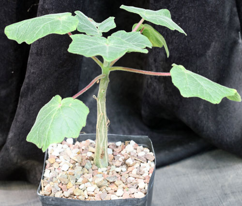 This small tree from northwestern Madagascar has large yellow flowers. The species name is misleading, since the leaves are only slightly peltate, and the leaves are mostly entire. This species is highly variable, however, and plants with deeply lobed leaves are possible. These seedlings are in one-gallon pots.