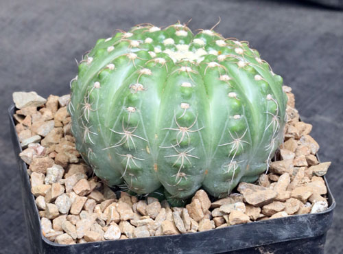 From Brazil, this species is now supposedly Parodia werneri. Well keep this in Notocactus because the flowers resemble other members of this supposedly defunct genus. The short globose-columnar plants slowly offset, and the body is green with gray-white spines. The flowers are reddish magenta. These plants are seedlings in one-gallon pots.