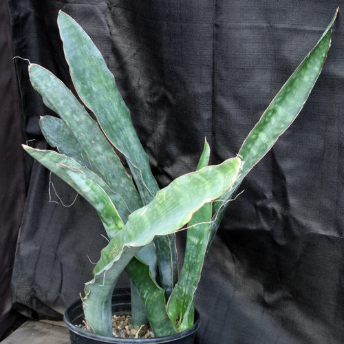 This recently described species is propagated from material originally collected near the type locality of Igomaa, Tanzania (Bhitala 1000). This broad-leaf species, once considered to be S. kirkii, has upright leaves that are thicker and taller than Sansevieria hallii, its potential relative. The leaves are stiff and dark, have a green background with obscure patterns, and have a thin, white-red shredding margin. This is the mature form of this species. These plants are rooted offsets in 3-gallon pots.