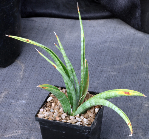 This undescribed species, from the region of central Kenya between Lakes Baringo and Borgoria, is probably related to S. dawei. The leaves are green with prominent banding and are relatively narrow with sharp tips. These plants are rooted offsets in 5-inch pots.
