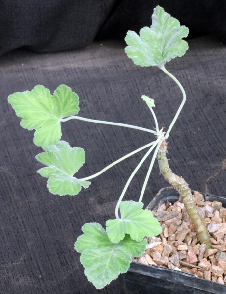 Frank Horwood collected this near Steinkopf, South Africa. It grows from potato-like tubers, like many Pelargonium, and produces a stem with purple-red fuzzy leaves. Flowers are pink with red spots on the upper petals. These plants are rooted cuttings in 5-inch pots.