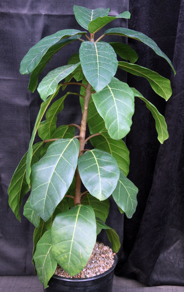 This large tree grows in coastal areas of eastern South Africa, extending northwards through Mozambique and into Zimbabwe, Malawi, and the Congo. The large, green leaves have yellow venation, which may or may not explain the name. The trunk is massive with aerial roots, which could make this an interesting subject as a rock fig, although this is a strangler fig, usually starting its life as an epiphyte. This plant can take salt spray, reflecting at least some hardiness, although it is unlikely to take much if any frost. These plants are seedlings in 2-gallon pots.