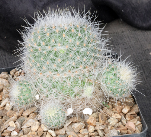 From the southern Chihuahuan Desert of Mexico, this is a sparsely offsetting globose species. The body is dominated by relatively long gray-white spines. The flowers are pinkish-white with violet tips. These plants are seedlings in one-gallon pots.