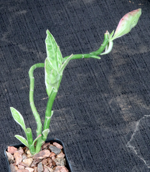 From Florida and some islands of the Caribbean Sea, this species has light yellow-green variegated leaves that are distorted. The flowers are bright red. These plants are rooted cuttings in 2-inch pots.